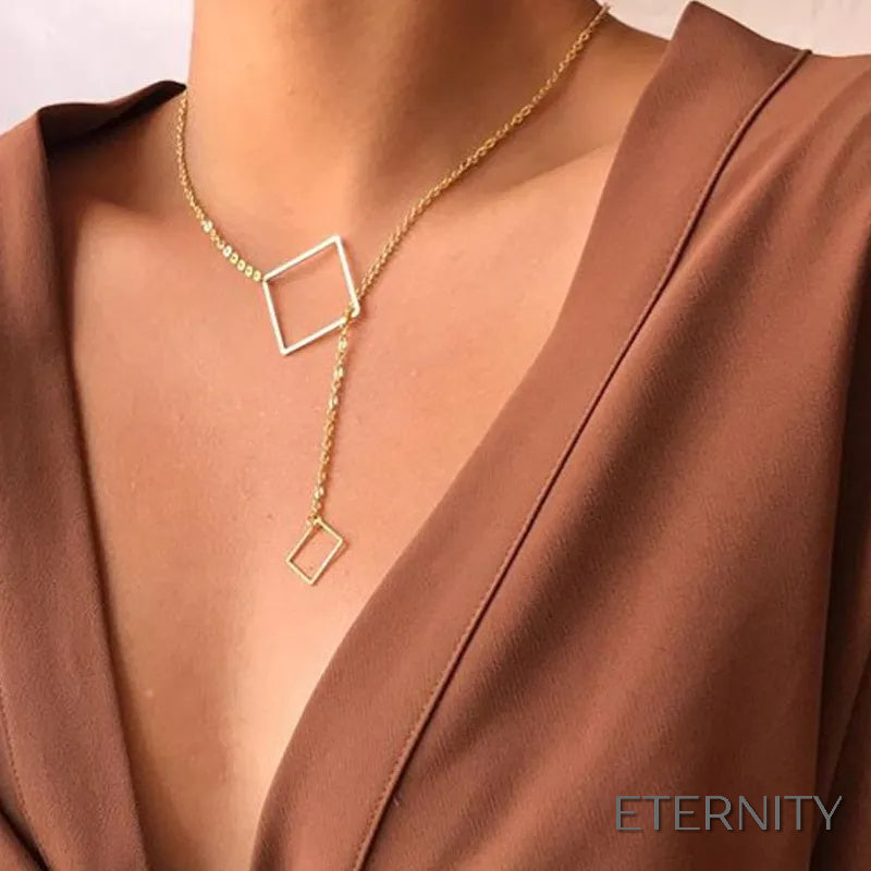 Un toque de geometría con un estilo retro y moderno. Esta delicada cadena dorada de ETERNITY presenta una fina cadena y dos dijes cuadrados huecos de diferentes tamaños, dispuestos en una elegante forma de 'Y'. Un accesorio atemporal y minimalista con detalles geométricos que añaden un toque distintivo y sofisticado a tu escote. Un esencial para un look creativo y elegante. #ETERNITY #DesignedToSparkle