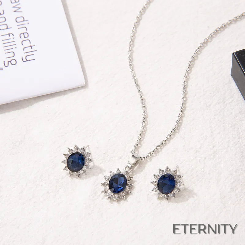 Set de Collar y Pendientes Plateados con Zafiro Tanzanita Ovalado y Halo de Rhinestones - ETERNITY
