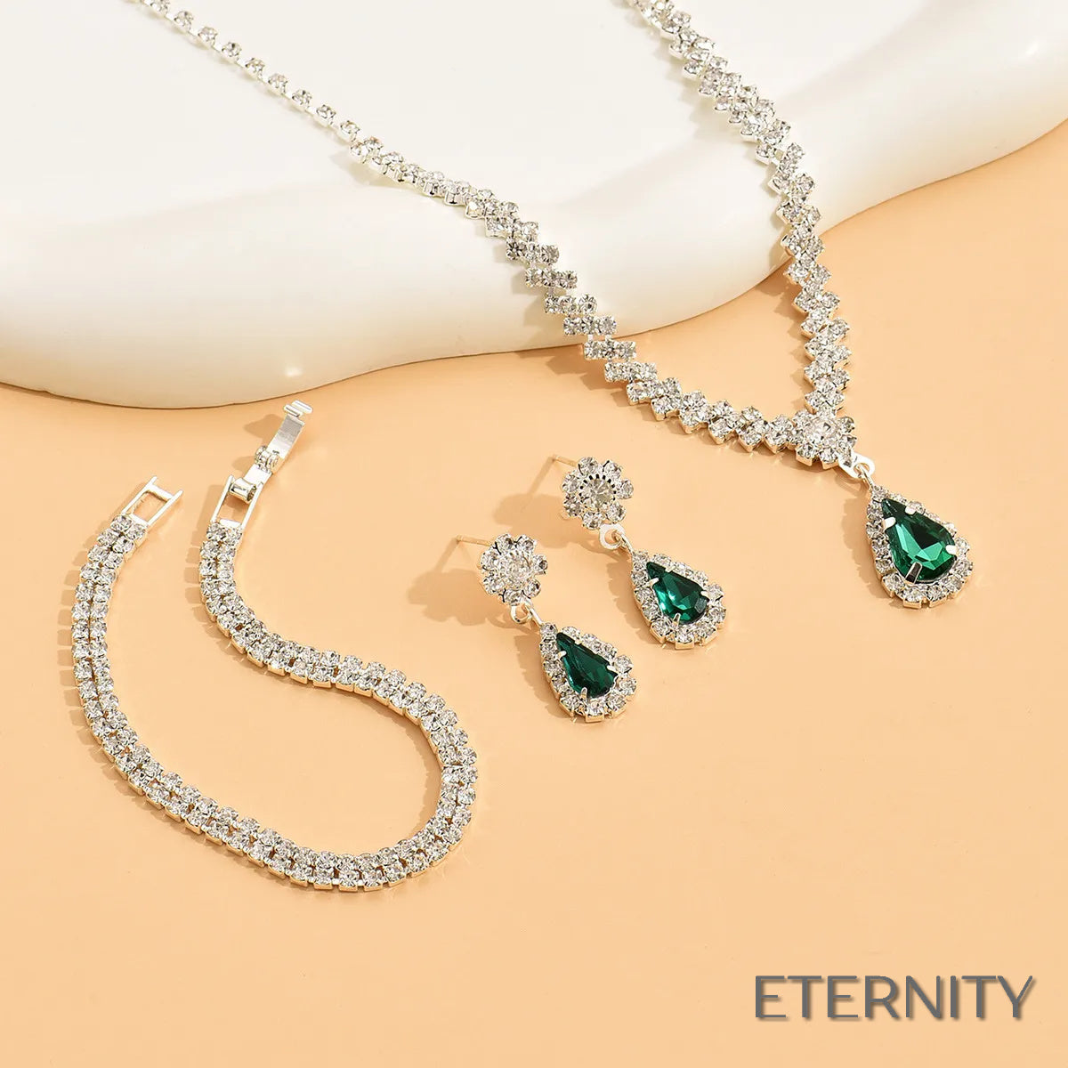Un esencial deslumbrante para un día inolvidable. Nuestro set de joyería nupcial de ETERNITY, con collar y pendientes de metal brillante y delicados rhinestones, irradia una elegancia atemporal. Los detalles brillantes y el diseño sofisticado te harán sentir radiante en tu día moderno. #ETERNITY #DesignedToSparkle